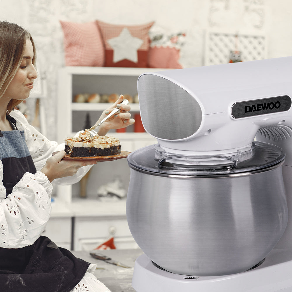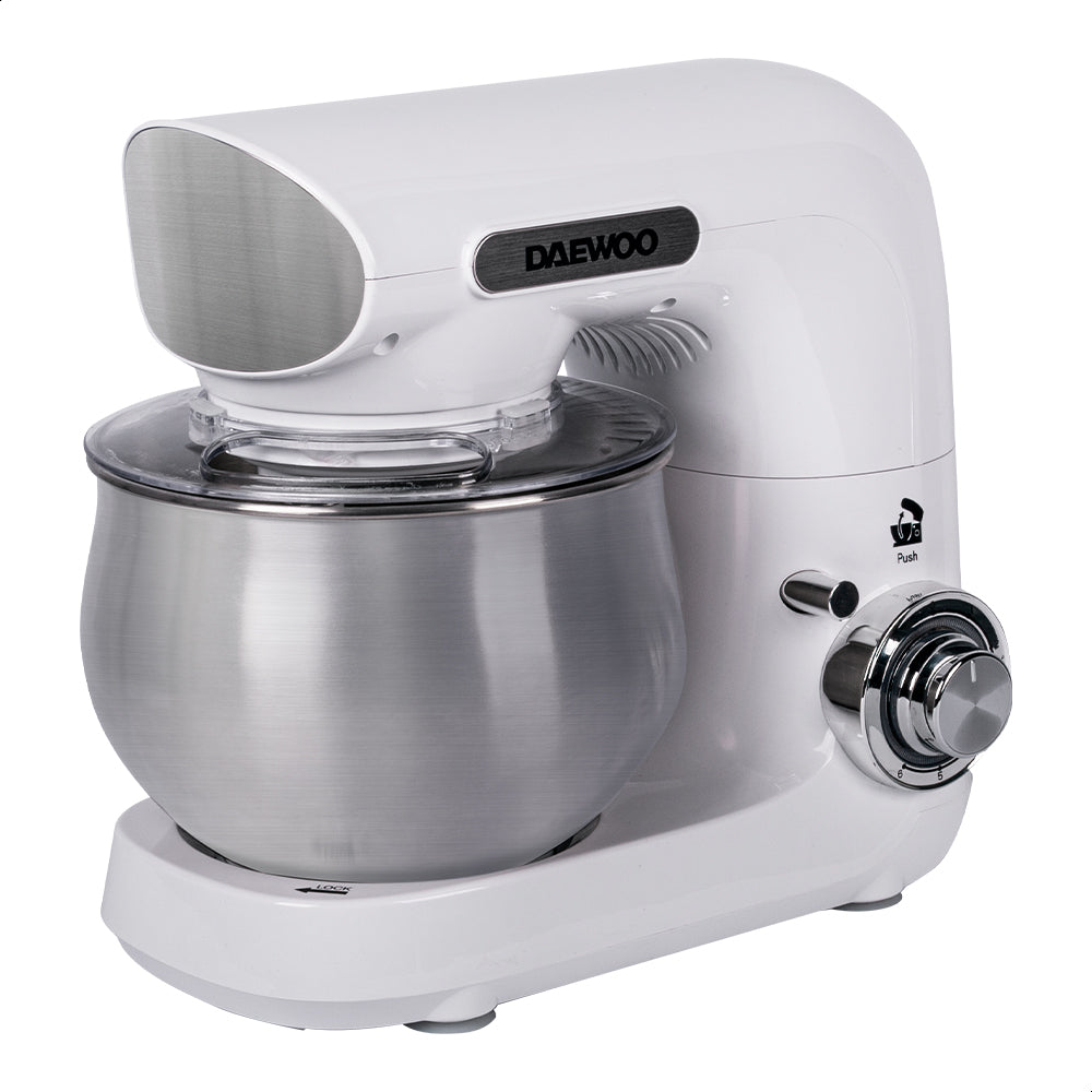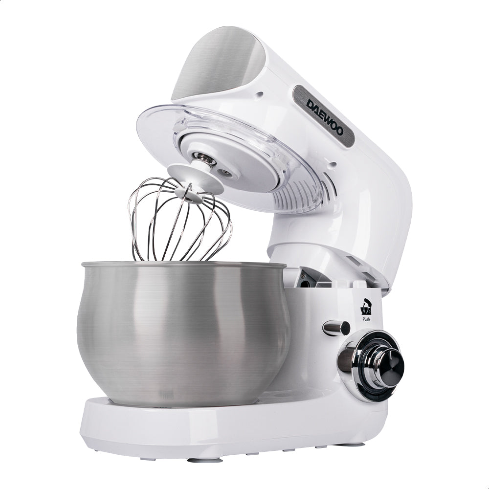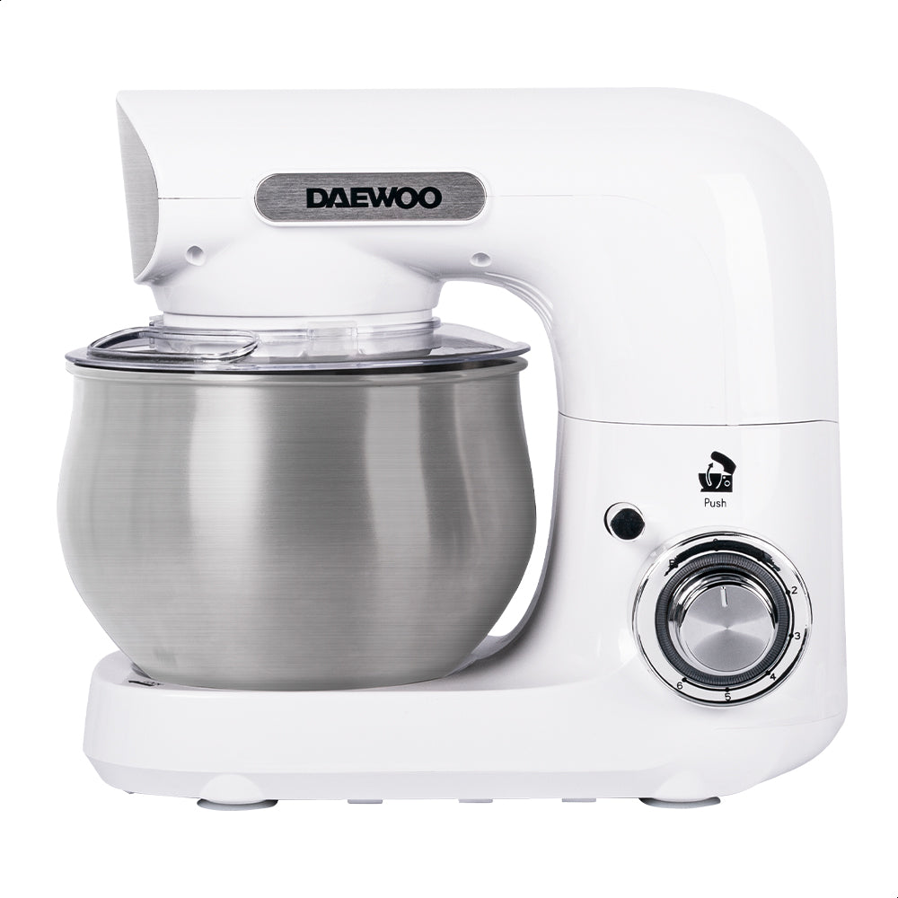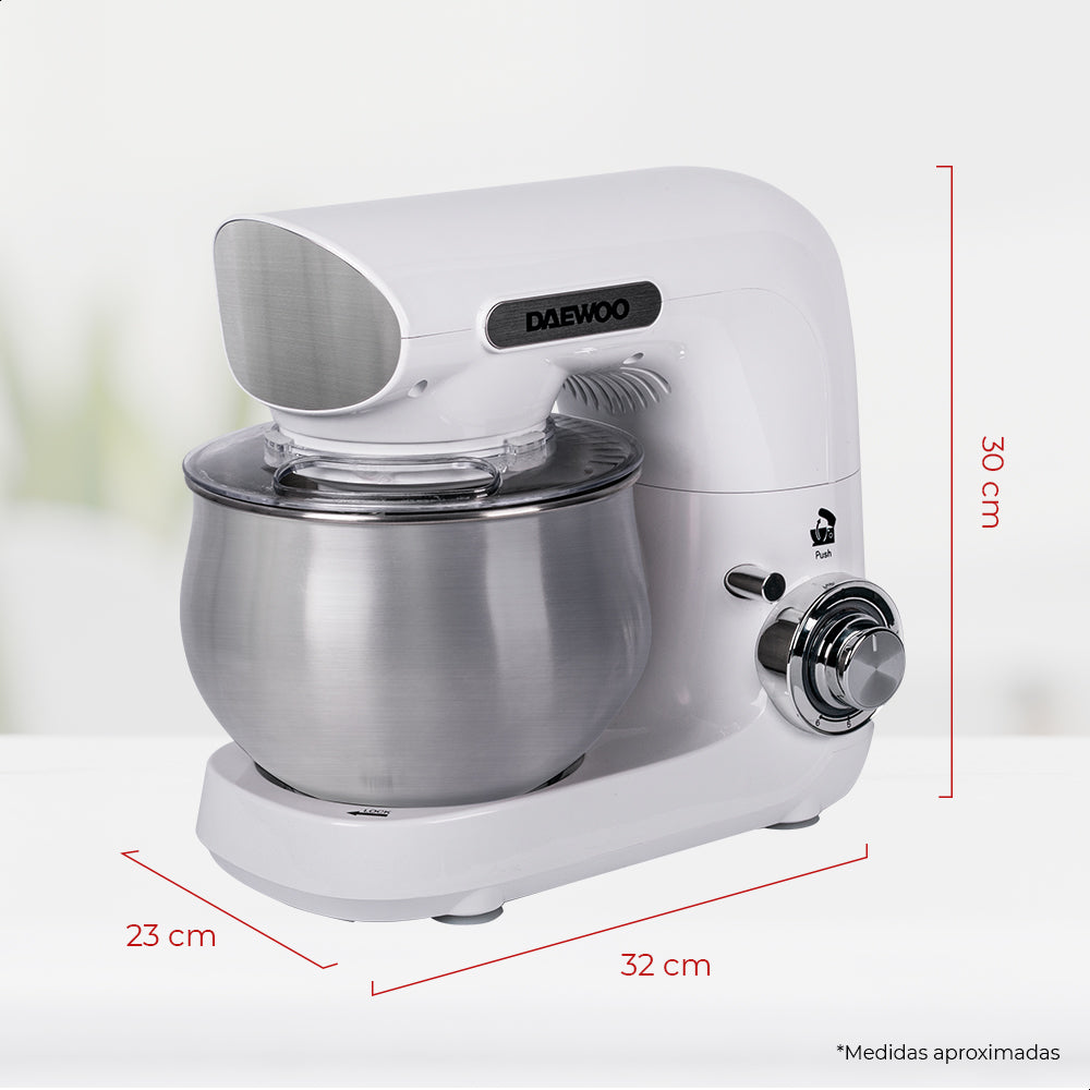 La batidora de pedestal Daewoo es una herramienta versátil con 6 velocidades y función de pulso, ideal para mezclar ingredientes de forma uniforme. Su diseño con cabezal inclinable facilita el acceso al tazón de 4 L, permitiendo una preparación rápida y eficiente incluso para grandes cantidades.