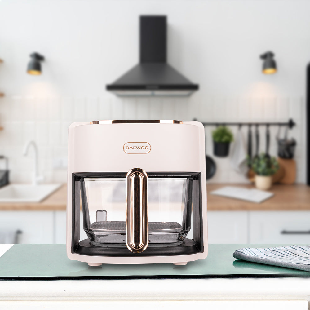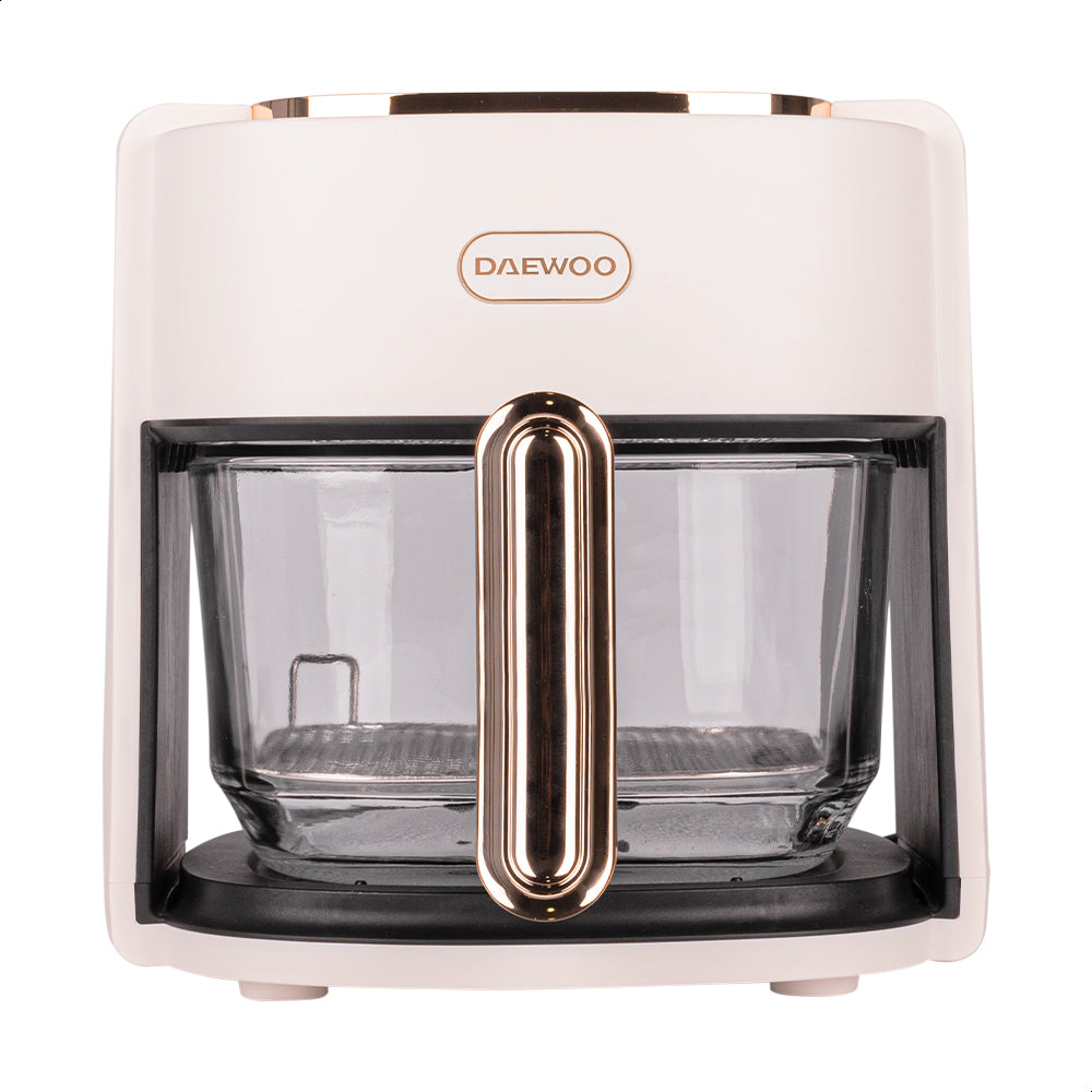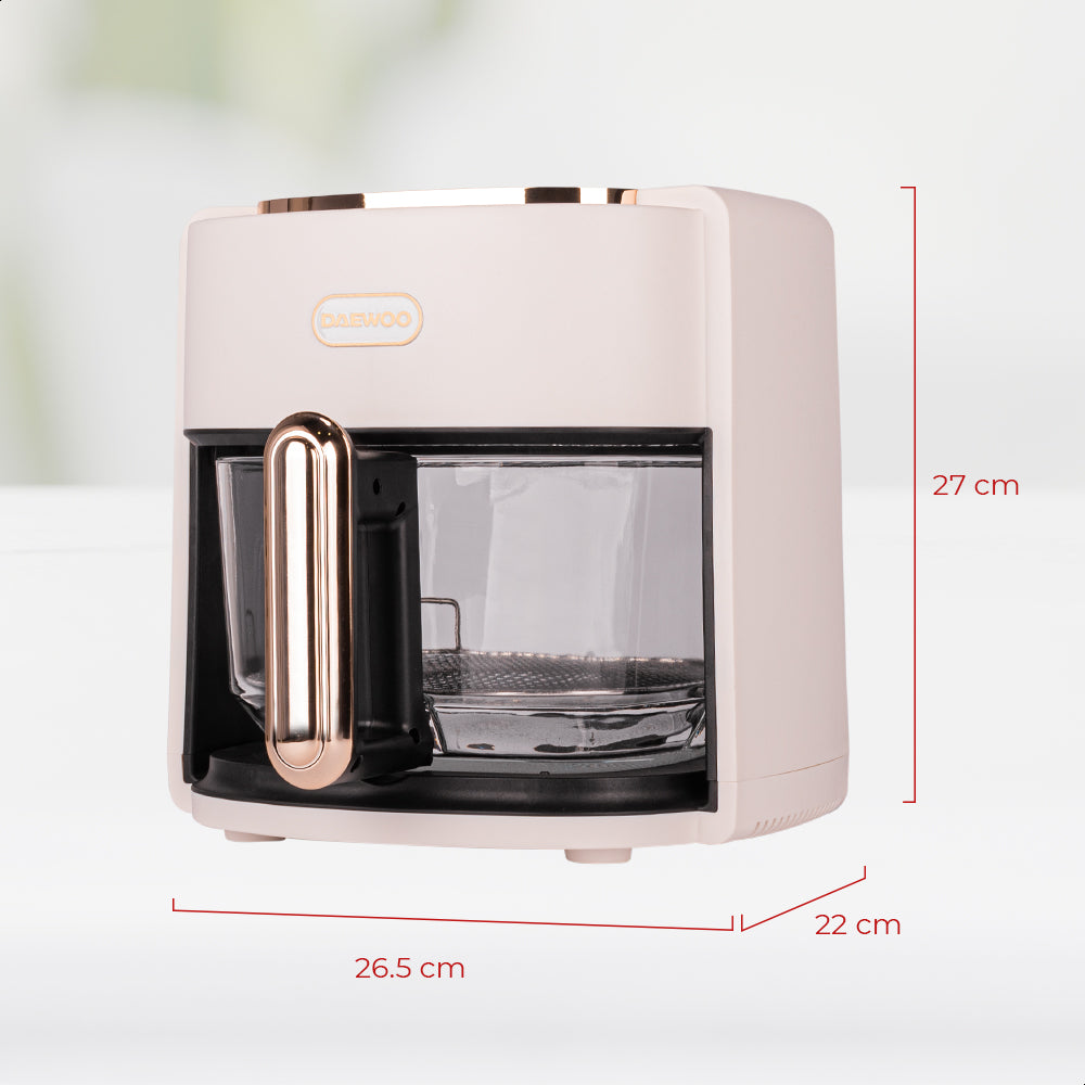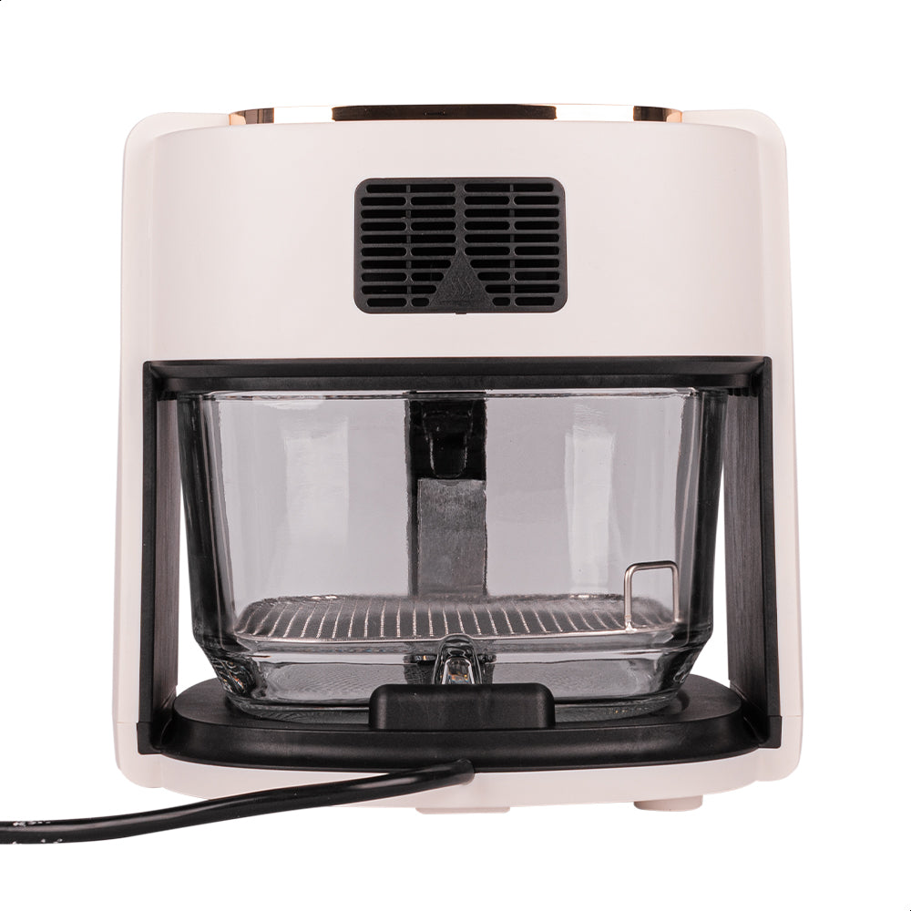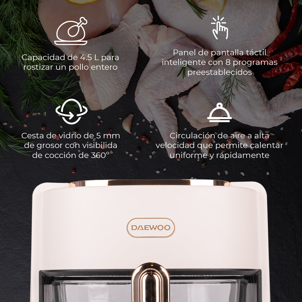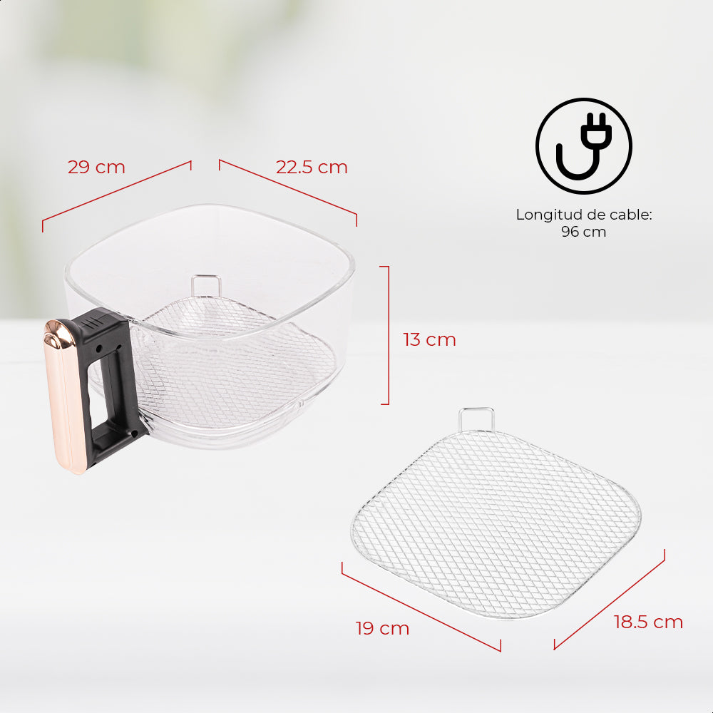 Si te encanta todo el sabor de la comida frita pero quieres cuidar tu salud, nuestra freidora de aire es la solución perfecta para ti. Con una capacidad de 4.5L, puedes rostizar un pollo entero y cocinar grandes porciones de alimentos saludables sin aceite ni grasa. Su cesta de vidrio templado de 5mm de grosor es libre de químicos y olores asociados a recubrimientos, lo que significa que tus alimentos estarán libres de sustancias dañinas y tendrán un sabor delicioso.Gracias a sus dos ventiladores turbo, la cocción de los alimentos es un 30% más rápida que en un horno convencional, y la circulación de aire a alta velocidad en 360° permite calentar uniforme y rápidamente. Cuenta con un panel de pantalla táctil inteligente, un temporizador de hasta 60 minutos, una temperatura ajustable de 60° C a 200°C y 8 programas preestablecidos para preparar cualquier tipo de alimentos.