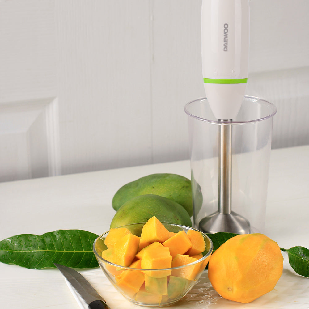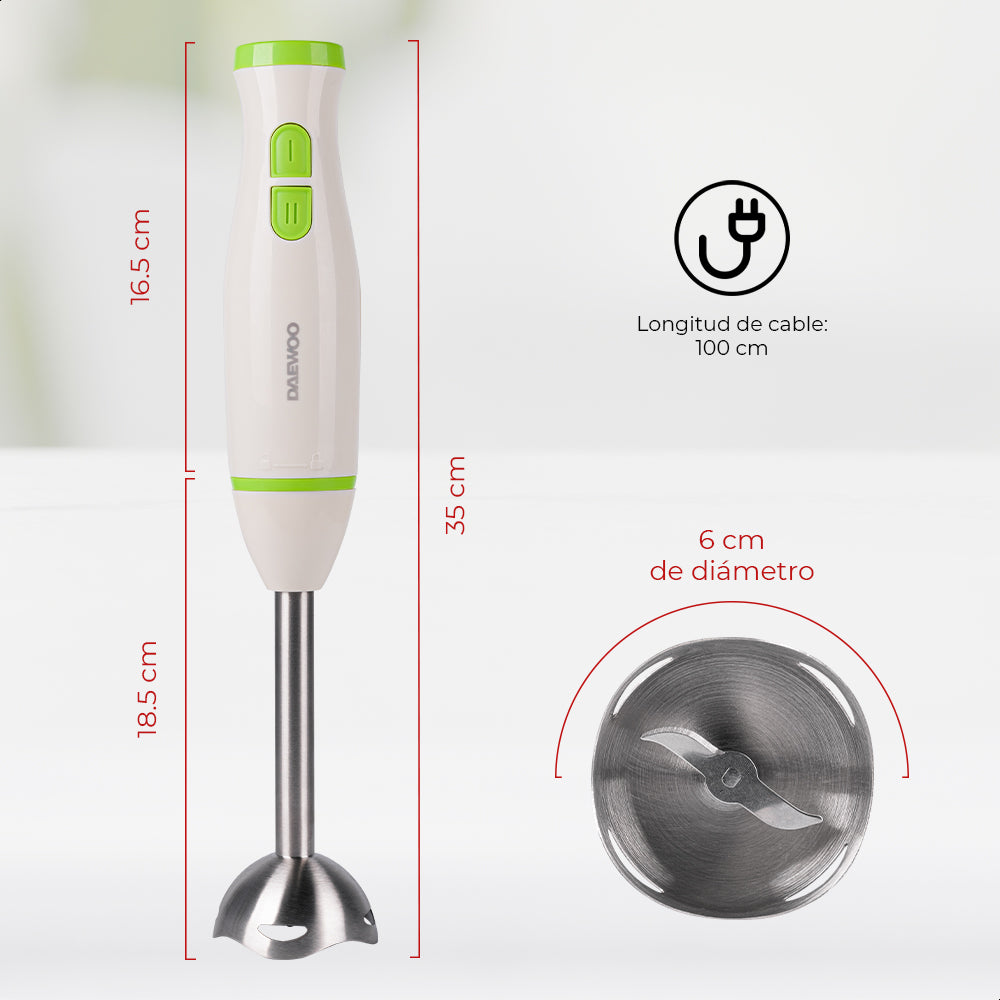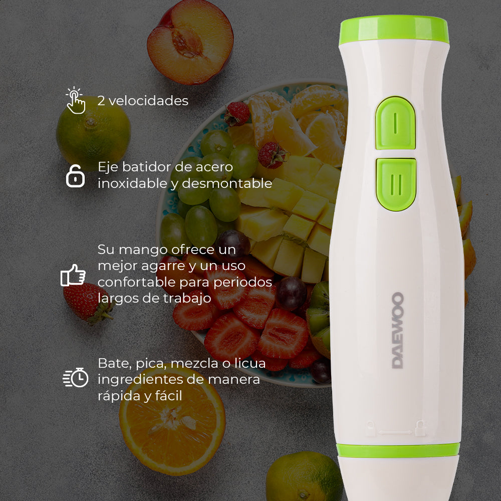 Con una potencia de 300W y compatible con una toma de corriente estándar, su diseño ergonómico y compacto la hace ideal para cocinas pequeñas. Perfecta para preparar una variedad de alimentos como frutas, verduras, sopas y salsas, es una alternativa rápida y eficiente a la licuadora tradicional de jarra.