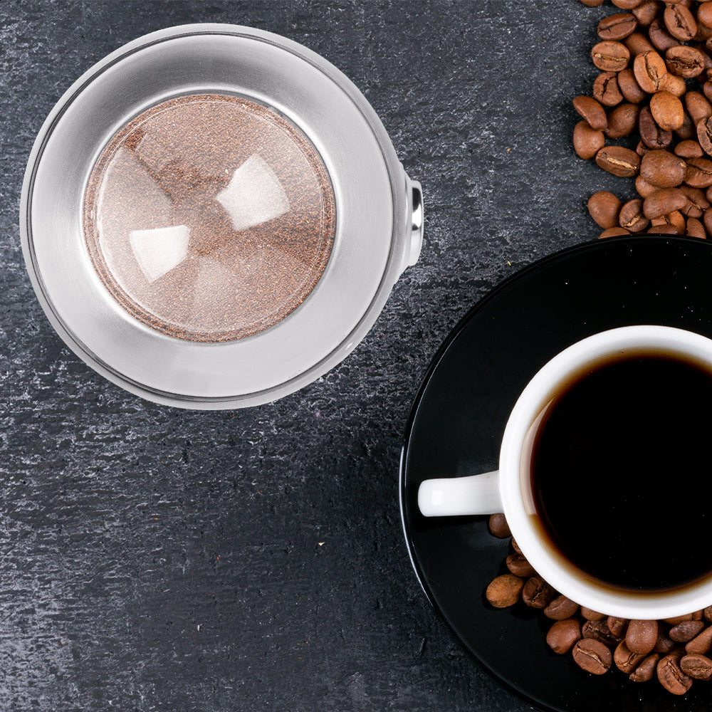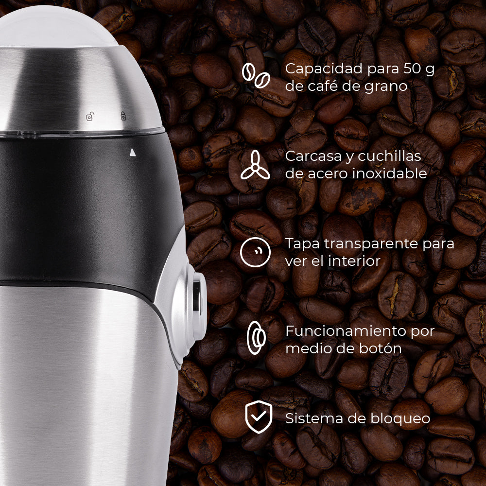 ¡Para los amantes del café! Con una capacidad de 50g y un funcionamiento por medio de un botón de pulso, podrás moler tu café en segundos y disfrutar de su aroma y sabor incomparables.