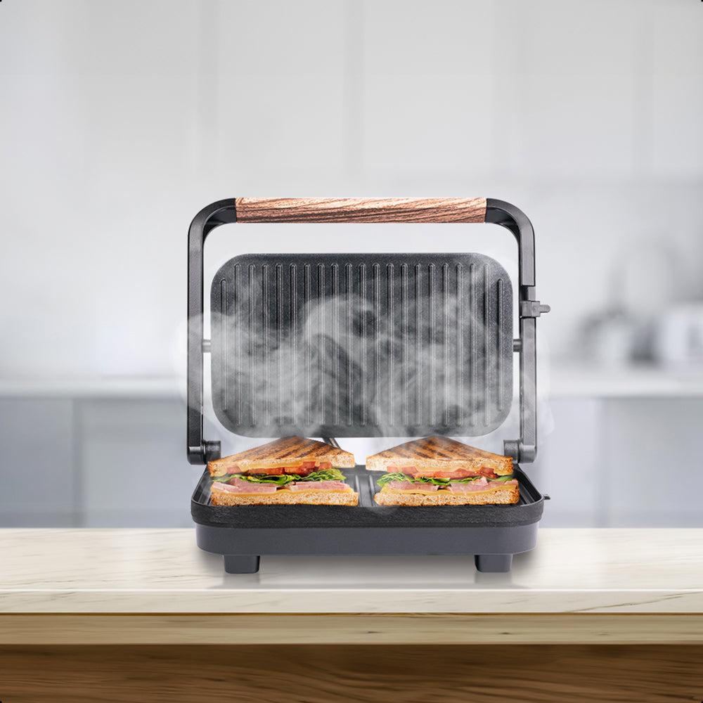 Con control automático de temperatura, las placas con revestimiento antiadherente garantizan una limpieza sencilla. Los indicadores luminosos de encendido y listo te mantienen informado, y el mango frío al tacto añade comodidad y seguridad a tu experiencia culinaria. ¡Haz de cada comida una experiencia gourmet con nuestra Panini Grill! ¡Compra ahora y disfruta de sabores deliciosos en cada bocado!