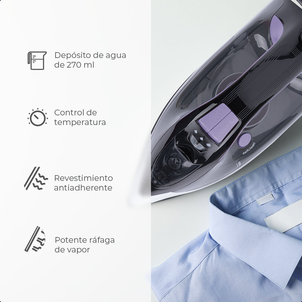 El control de temperatura ajustable te brinda precisión en cada tejido, y la función de auto-limpieza garantiza un rendimiento duradero. Además, el depósito de agua generoso de 270 ml permite sesiones de planchado más prolongadas. Con una superficie antiadherente para un deslizamiento suave, esta plancha hace que el proceso sea más eficiente y placentero. ¡Haz del planchado una tarea fácil y disfruta de prendas impecables con nuestra avanzada plancha de vapor!
